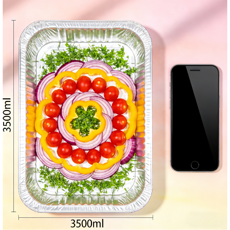 Our 3500ml extra-large aluminum foil container is designed for big parties, family feasts, catering events, and BBQs. Made from heavy-duty food-grade aluminum, it handles large portions of roasted meats, paella, casseroles, or buffet-style dishes with ease. This generous size serves 10-14 people, eliminating the need for multiple trays.