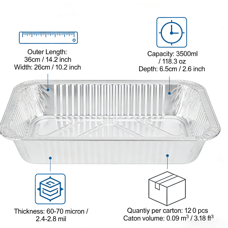 3500ml (118.3oz). Outer 36x26cm (14.2x10.2in), depth 6.5cm (2.6in). Food grade aluminum (8011). Thickness 60-70 micron (2.4-2.8 mil). Oven/microwave safe -20°C to 220°C. Packing: 120 pcs/carton. Carton volume 0.09m³ (3.18ft³). FDA, SGS, ISO.