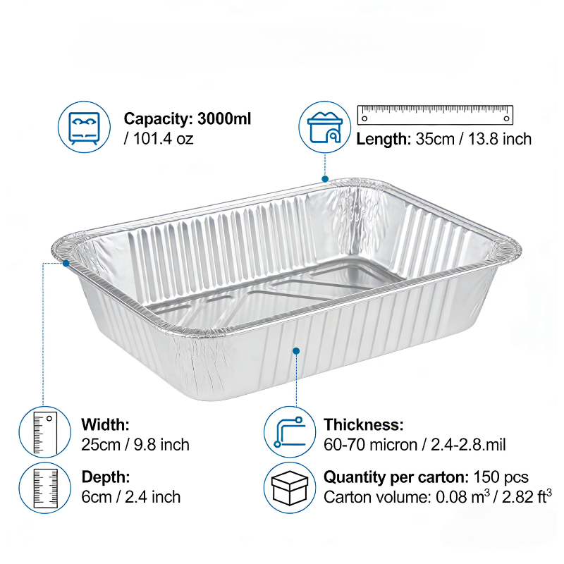 3000ml (101.4oz). Outer 35x25cm (13.8x9.8in), depth 6cm (2.4in). Food grade aluminum (8011). Thickness 60-70 micron (2.4-2.8 mil). Oven/microwave safe -20°C to 220°C. Packing: 150 pcs/carton. Carton volume 0.08m³ (2.82ft³). FDA, SGS, ISO.