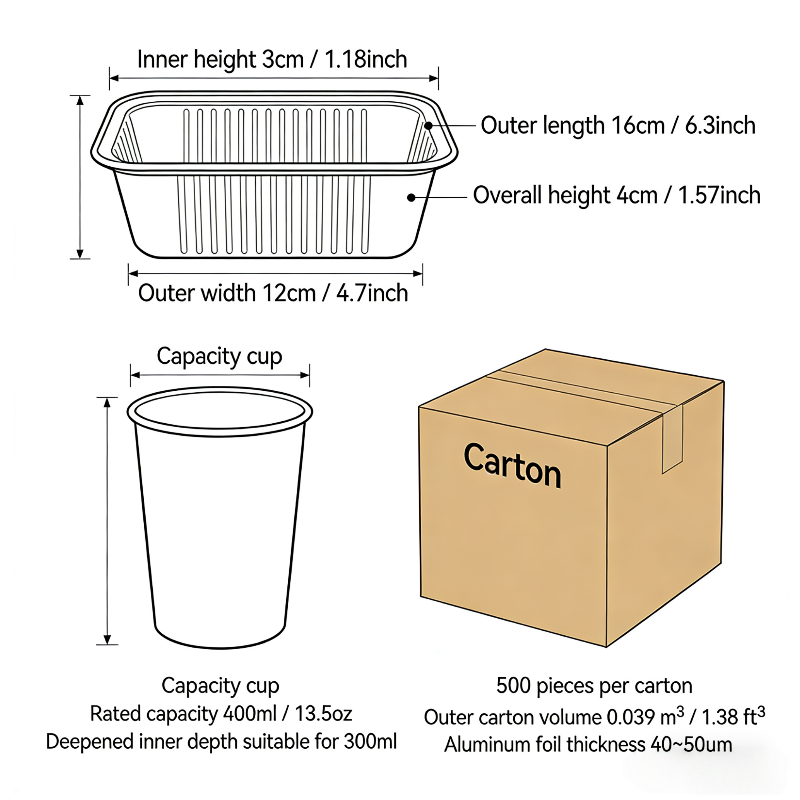 Manufactured in our ISO-certified factory, each 400ml square container is made from high-quality food-grade aluminum (8011/3003 alloy). The smooth rolled rim ensures safe handling without sharp edges, while the rigid construction maintains its shape even with heavy foods. Our containers are produced under strict quality control, ensuring consistent thickness and performance.