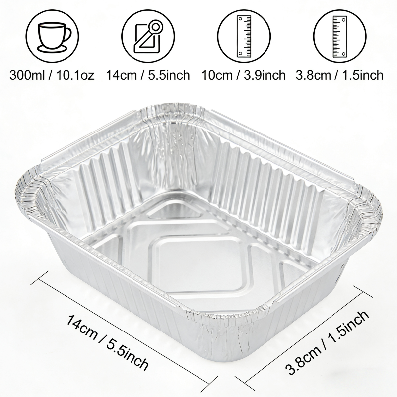 300ml capacity (10.1oz). Top 14x10cm (5.5x3.9in), depth 3.8cm (1.5in). Food grade aluminum (8011). Thickness 40-50 micron. Oven/microwave safe -20°C to 220°C. 50pcs/bag, 500pcs/carton. FDA/SGS/ISO.