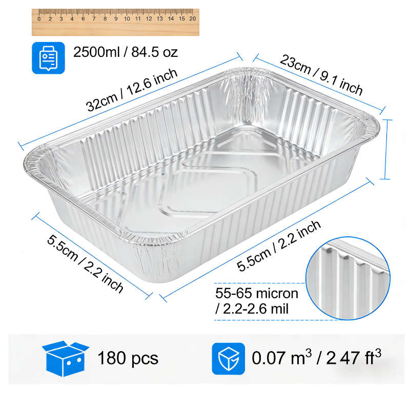 2500ml (84.5oz). Outer 32x23cm (12.6x9.1in), depth 5.5cm (2.2in). Food grade aluminum (8011). Thickness 55-65 micron (2.2-2.6 mil). Oven/microwave safe -20°C to 220°C. Packing: 180 pcs/carton. Carton volume 0.07m³ (2.47ft³). FDA, SGS, ISO.